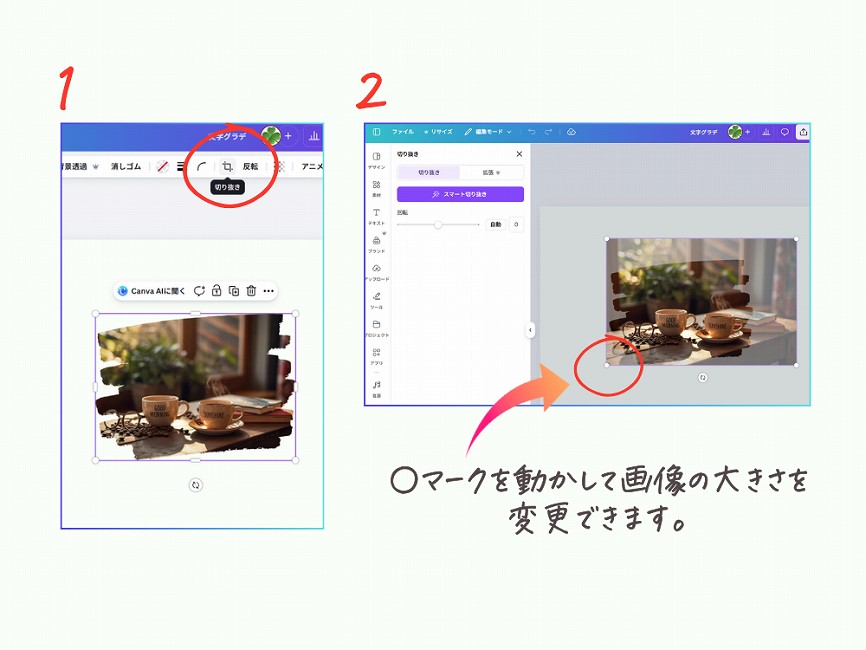 - 写真の角の丸〇を斜めに動かすと、大きさも調整できます