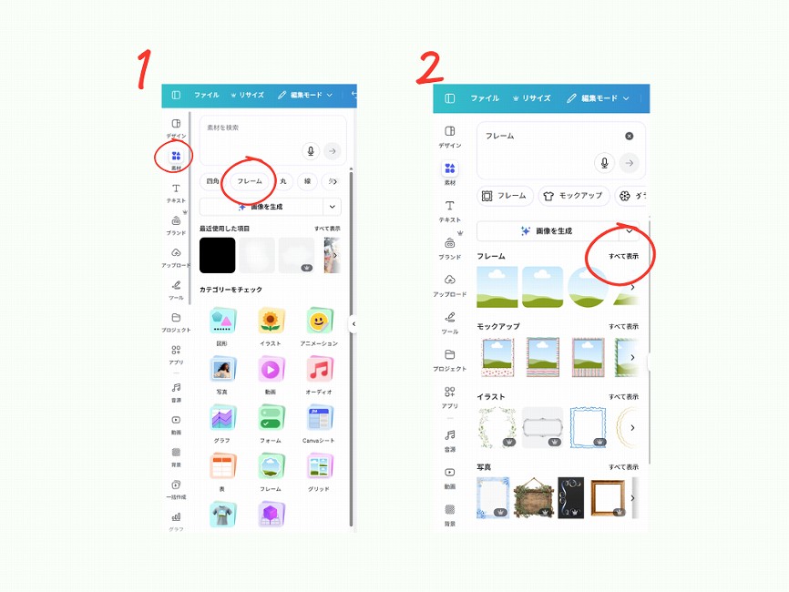 - 「素材」メニューから「フレーム」を選択