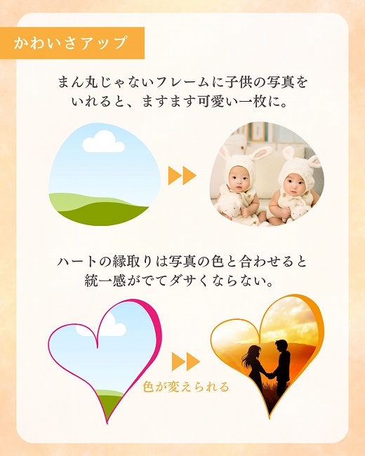 フレームを使うと、写真をあらかじめデザインされているオシャレな形に切り抜くことが出来ます。