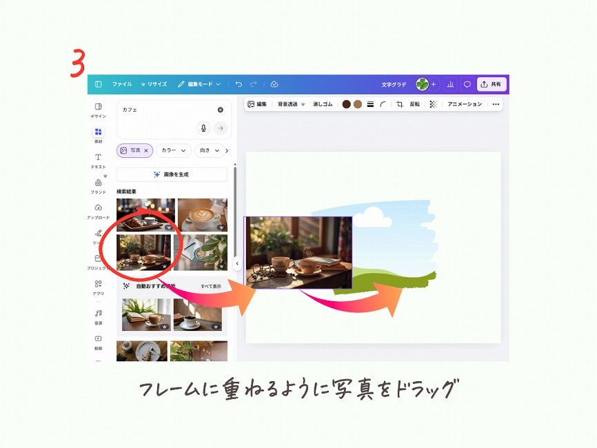 Canvaのフレーム機能は、ドラッグするだけで写真の形を変えられる機能です。