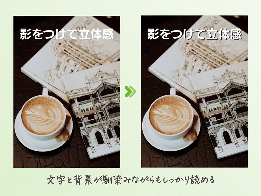 文字に影をつけるだけで、文字が背景からふわっと浮き上がり、立体感が生まれてグッと読みやすくなります。
