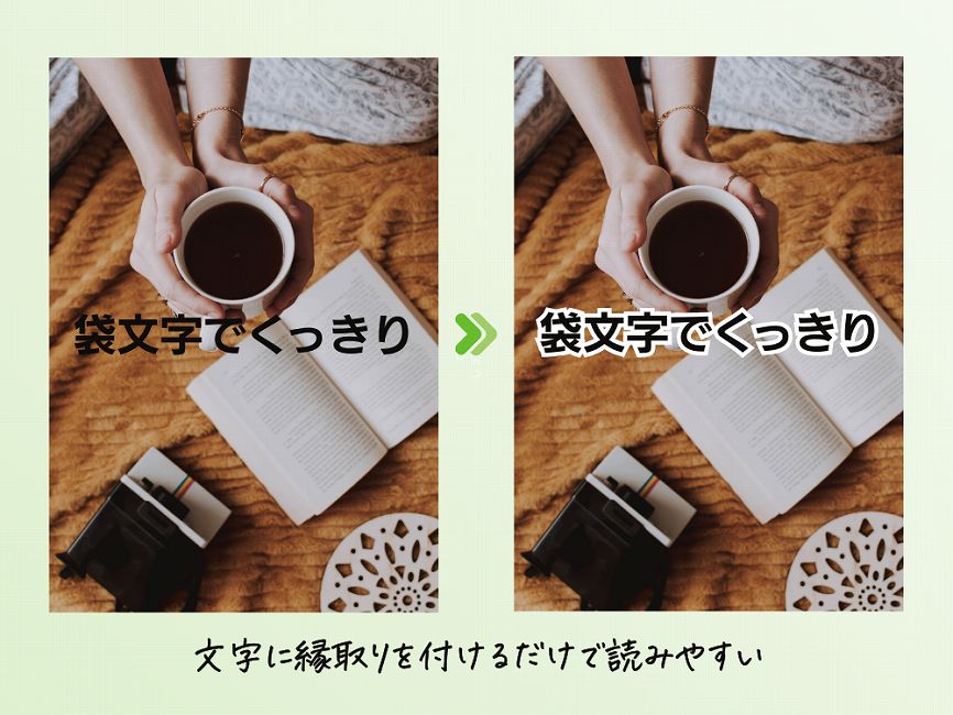 文字の周りに白や黒の縁取りもつけると、どんな背景でも文字がすっと浮き上がって見えるようになります。