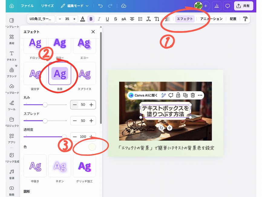 Canvaでは「エフェクト→背景」を使うことで簡単にテキストの背景色を設定できます。