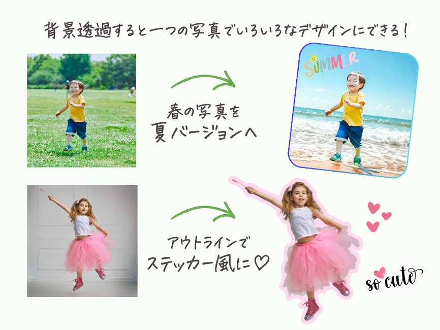 しかも子供の写真をいろんなデザインに加工するときに、背景透過はかなり使えます!こんな風にして使えるので、たくさんの写真から探す手間も省けます。👇