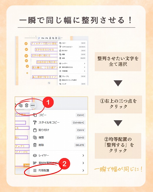 実はCanvaには、まとめてキレイに揃えられる「均等配置」の機能があります。
